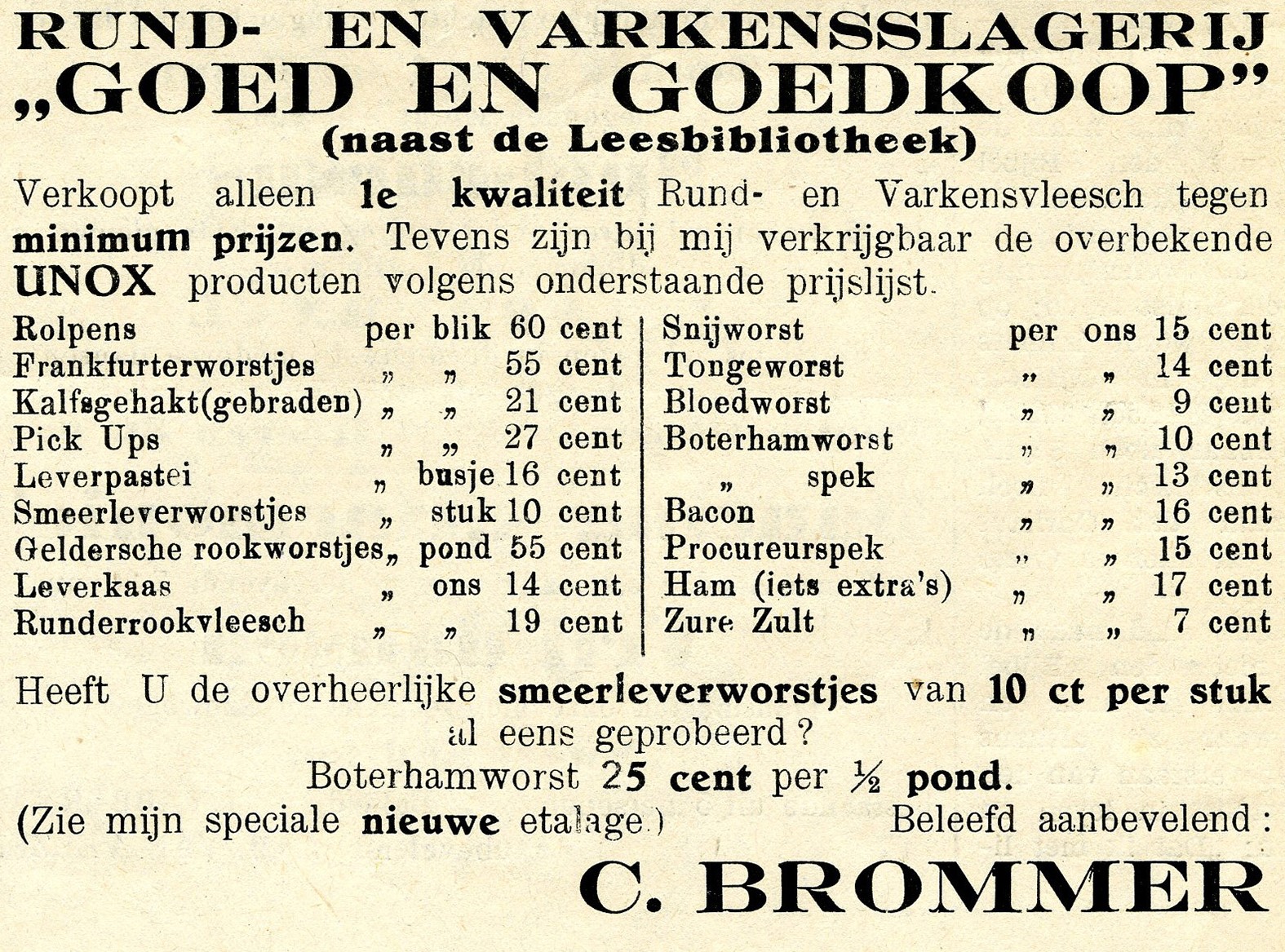 Advertentie van slager C. Brommer uit Het Hoeksche Weekblad van 17 maart 1939. Op de derde regel staat ‘naast de Leesbibliotheek’.