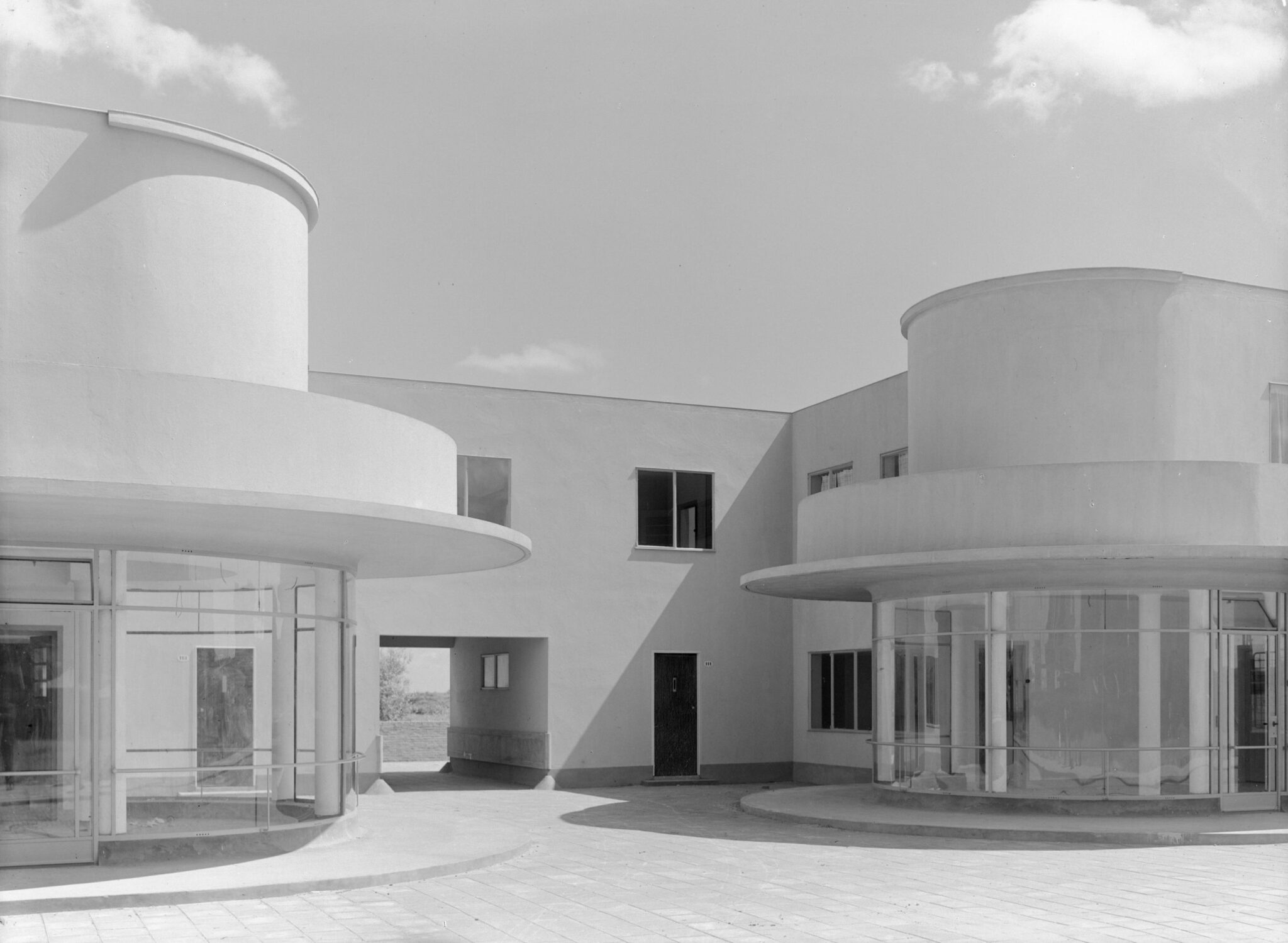 Invloeden van de Stijl komen terug in het kleurgebruik: witte gevels, gele baksteen, blauwe deuren en hekken en rode lantaarns.
